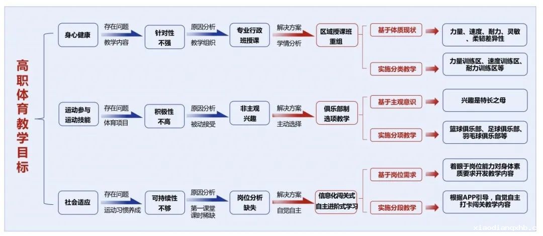竞赛评价融入技能标准,基于岗位需求的分段式教学模式。学校将竞赛评价标准与岗位能力需求标准对接,构建以岗位能力需求为导向的公共体育教学内容,并探索分段式教学模式。分段教学分为两段:第一段针对岗位客观身体条件需求,实施针对性运动处方,提升学生对岗位能力需求的适应性;第二段针对岗位可能导致的身体状况变化,实施预防性运动处方,最大程度规避岗位对身体产生的负面影响。